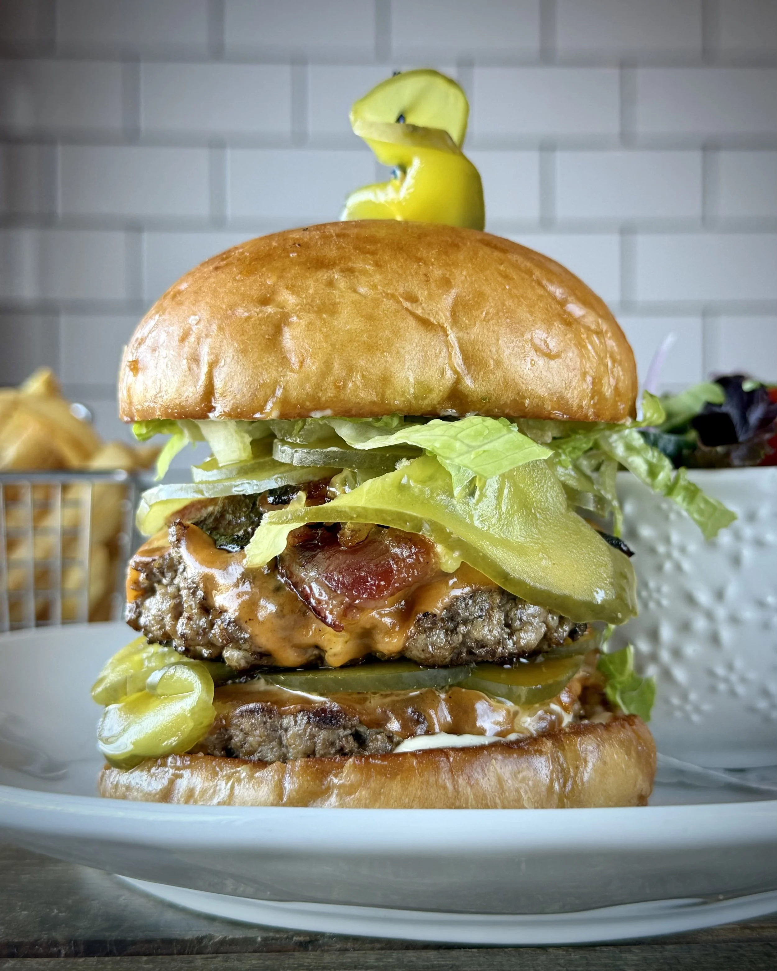 Two 3 oz. smashed ground chuck patties, layered with melted cheddar. Topped with hot honey–glazed bacon, dill pickles, and shredded lettuce, then finished with our housemade garlic dill aioli on a toasted brioche bun.